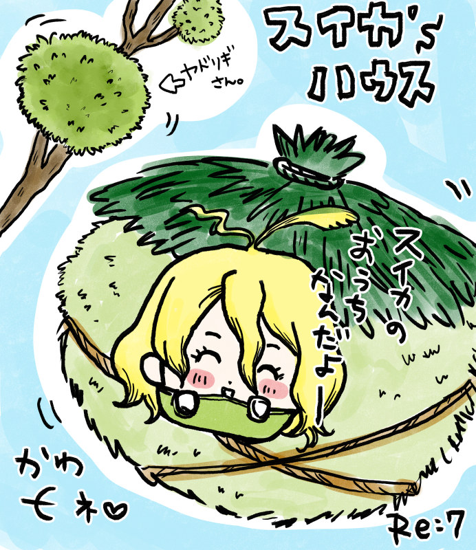 葉っぱのお舟に乗って、頭にも葉っぱのっけてるスタン。